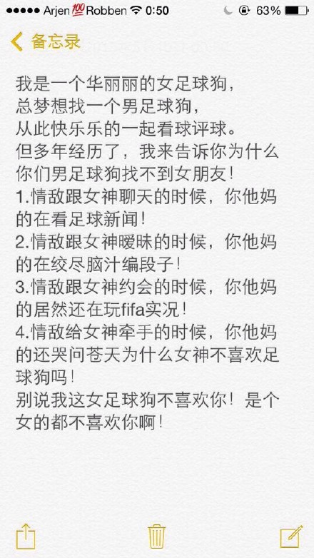 10、女足球狗为什么找不到男盆友:1.别的妹纸的SNS自拍 鸡汤,你的是主队cp和各种段子;2.别的妹纸吃完饭说“我们去看电影吧”你是“我要回家看球”;3.别的妹纸花几千买衣服你花几千买球衣;4.如果有异性发来“晚安”,别的妹纸温柔一句“你也是”你是“睡你麻痹劳资要看球”(via@天才软)
